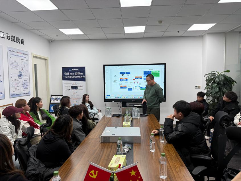 随后,师生团队前往大连秘阵,开启了对密码技术领域的专项研学。作为专注于信息安全领域的创新型企业,大连秘阵为此次研学量身定制了 “理论 + 实操” 的学习内容。公司负责人孙总以《密码技术:网络安全的核心基石》为题,从密码技术的发展历程、核心原理(如对称加密、非对称加密、哈希算法)讲起,逐步延伸至行业应用规范(如《中华人民共和国密码法》相关要求),并结合金融、能源、政务等关键领域的案例,深入解读了密码技术在数据传输加密、身份认证、敏感信息保护中的关键作用,帮助师生构建起系统的密码技术知识框架。企业高级程序员聚焦 “密码机” 这一核心设备,通过拆解设备结构、演示操作流程、分析技术参数等方式,生动讲解了密码机的研发逻辑、工作机制及在关键信息基础设施中的部署应用场景;同时,还现场邀请师生参与简单的密码机操作体验,让大家在“动手实践”中加深对理论知识的理解,真正实现了 “从听懂到会用” 的认知跨越。