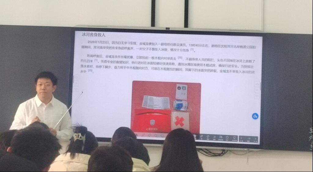 邢鹏老师的课堂以“从少年梦到英雄魂”为主题,通过对金城龙同志事迹的致敬,引导学生在感动之余,更要理性思考。他结合冰面落水等真实场景,详细讲解了突发事件中的科学处置流程,强调了“救援者安全优先”的原则,教导学生拒绝盲目蛮干,学会利用长棍、绳索等工具实施牵引救援,并深入解读了应急预案的编制与管理,让同学们明白预案是守护生命的科学防线,而非空洞的文本。