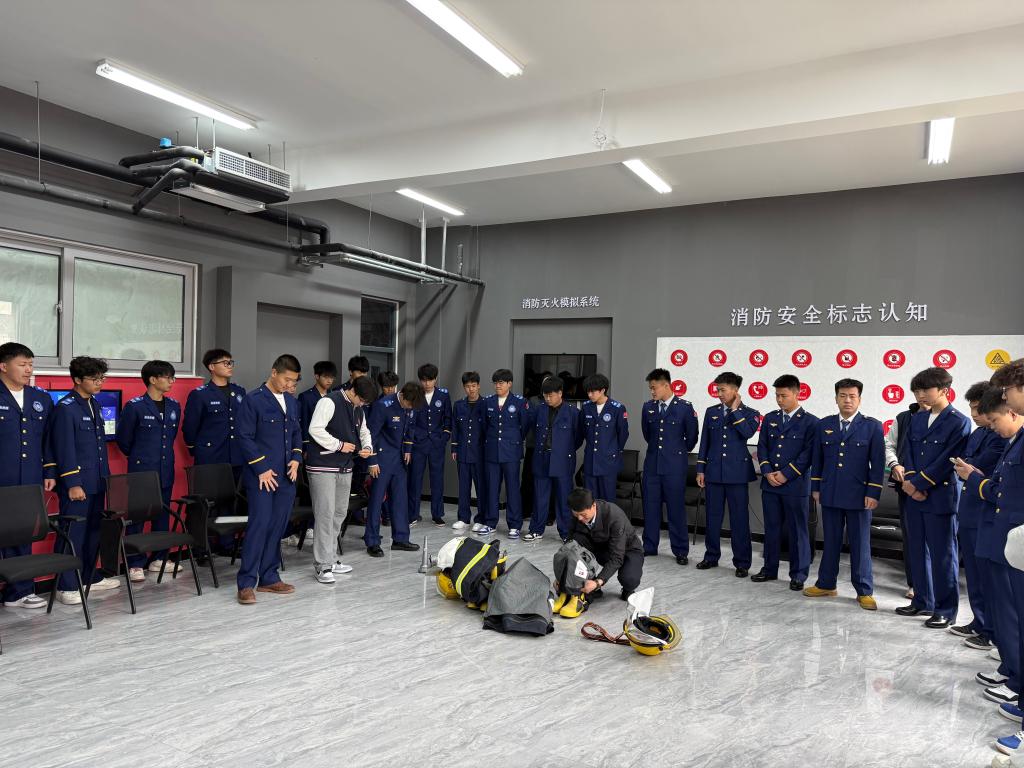 课堂上,教师带领学生们走进消防救援实训室,化身 “实战导师”,通过现场演示消防服迅速穿戴技巧和消防水带实操动作要领,将理论知识转化为直观可见的实践操作。“消防服穿戴讲究一个‘快’字,同时要确保每一处扣带都稳固扣紧,这直接关系到救援人员的安全。” 教师一边讲解,一边进行标准示范,精准的动作、专业的讲解,让学生们对消防救援工作有了更深刻的认识。
