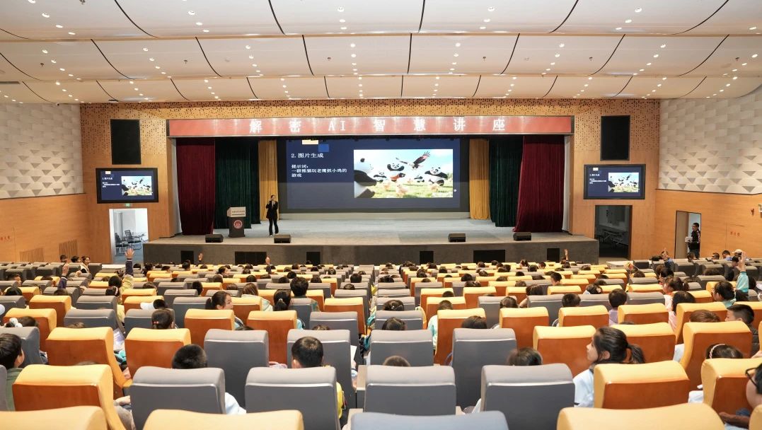 “当AI学会写诗,人类的情感会被替代吗?”在智慧讲座现场,主讲老师抛出的问题引发热烈讨论。通过趣味动画演示,孩子们了解到AI在智能交通、现代工业等领域的应用场景。最令人兴奋的是“AI说话”互动环节,孩子们上传自拍照后,系统瞬间生成自动讲话视频,形象生动,惊叹声此起彼伏。